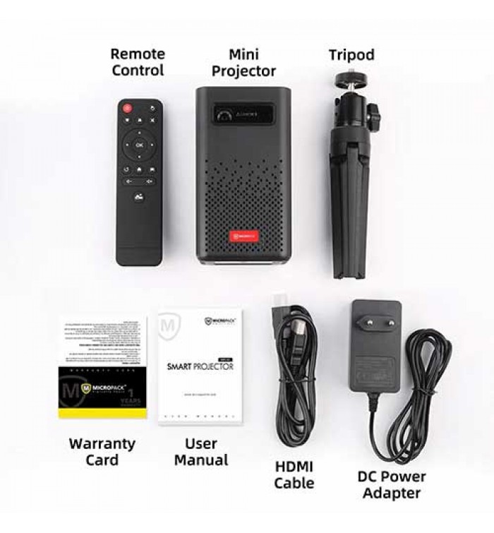 Box Content: 1. Mini Projector 2. Projector Carry Case 3. Remote Control 4. DC Power Adapter 5. HDMI Cable 6. Tripod 7. User Manual 8. Warranty Card